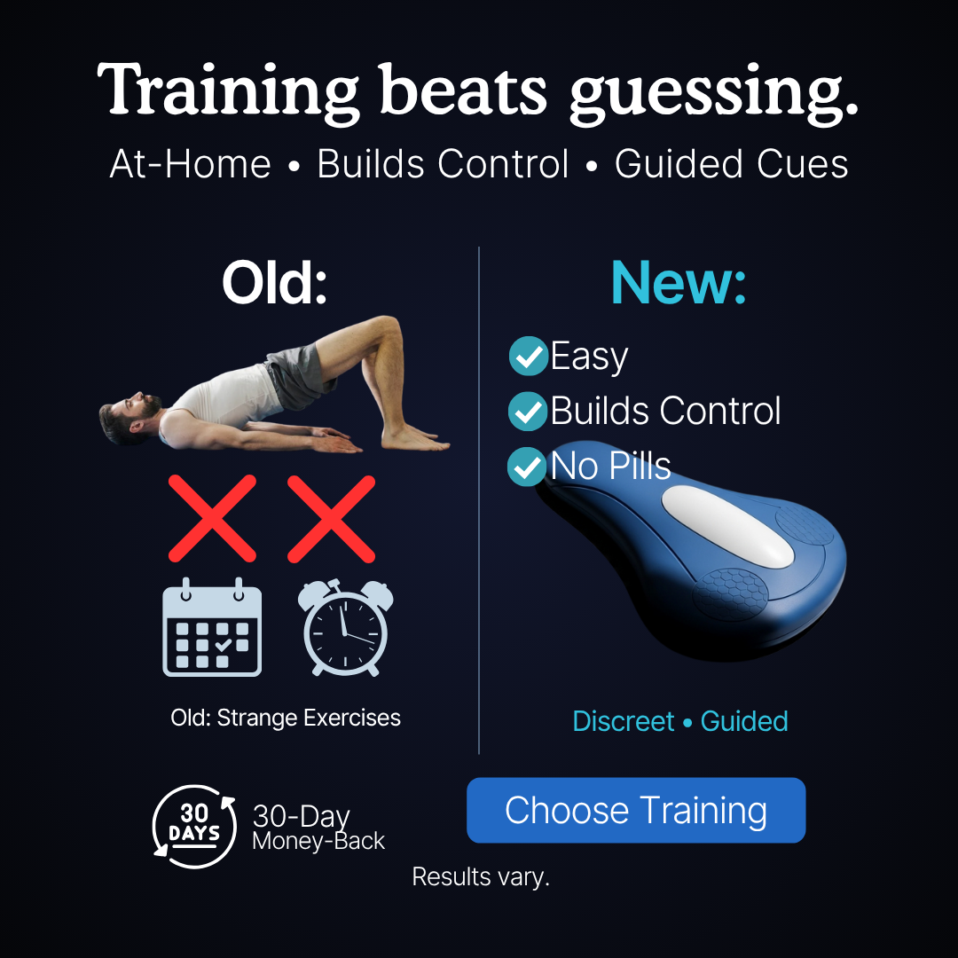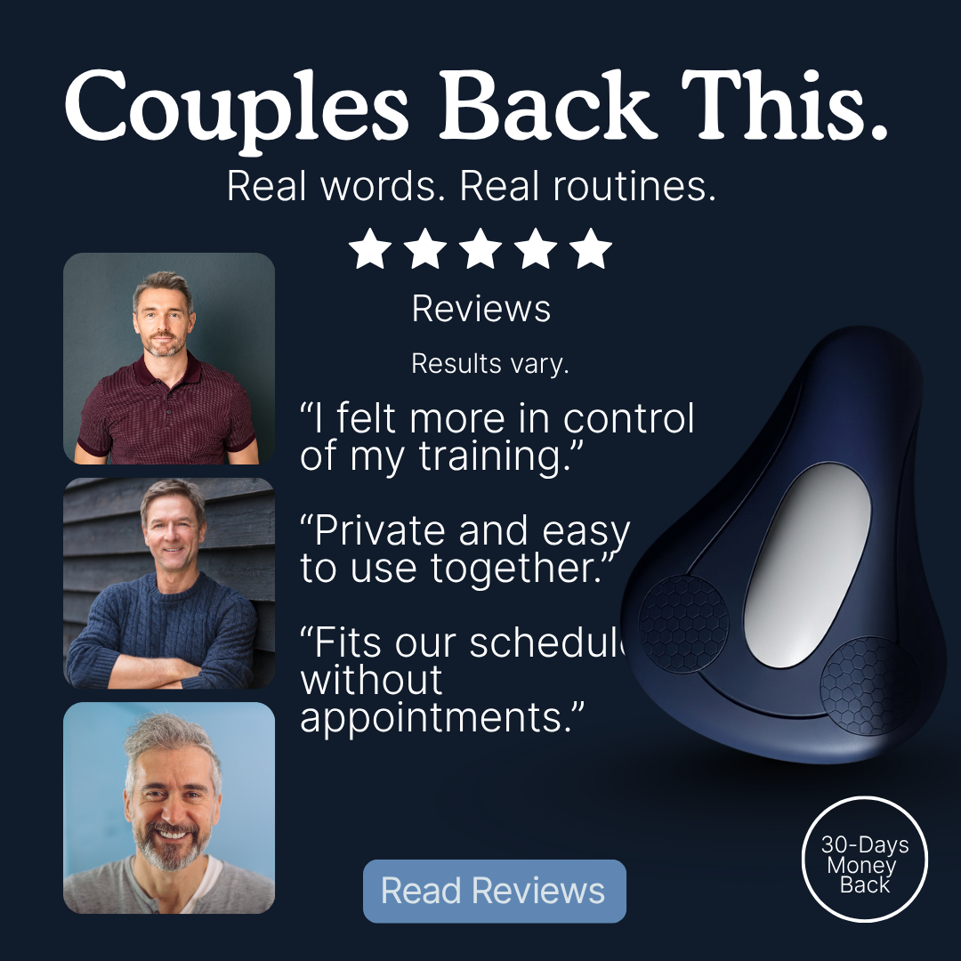 PelviPulse™ Men fits busy days: sit, press, and train for 15 guided minutes at home. Gentle vibration cues the pelvic floor so you can build control without clinics or guesswork. Simple. Private. Consistent.